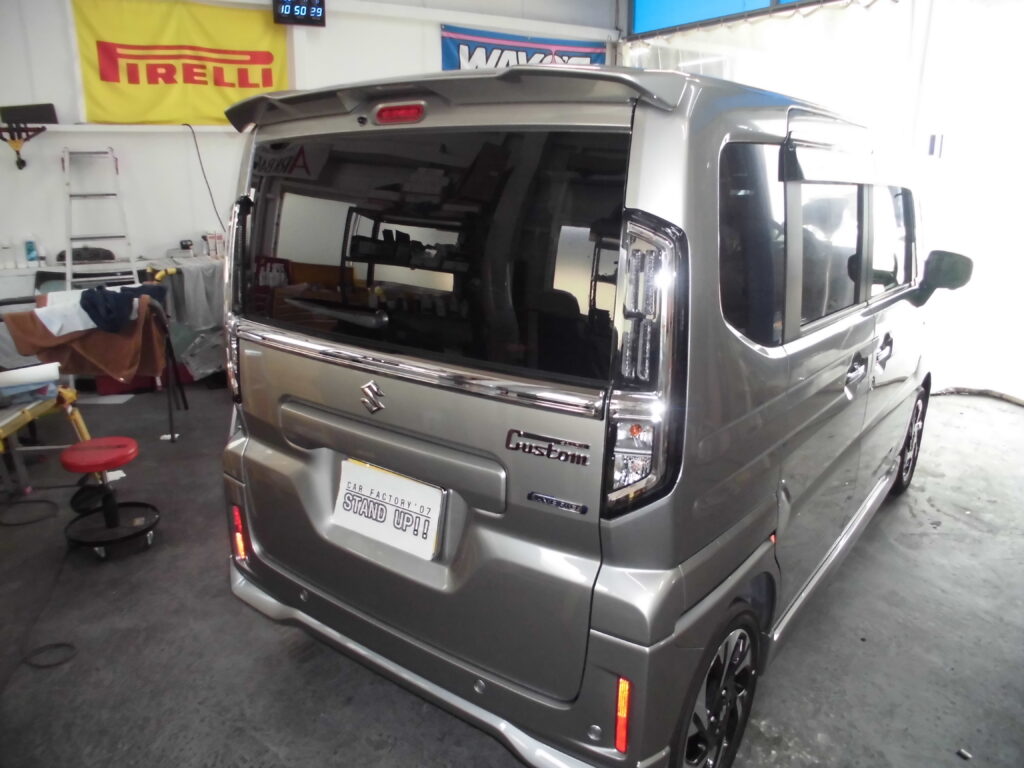 滋賀県O様よりスペーシアカスタムをご入庫いただきました。 今回は15%のカーフィルムを施工しております。 遮熱や熱線遮断効果だけでなく、プライバシー保護効果もあるカーフィルムを施工しました。